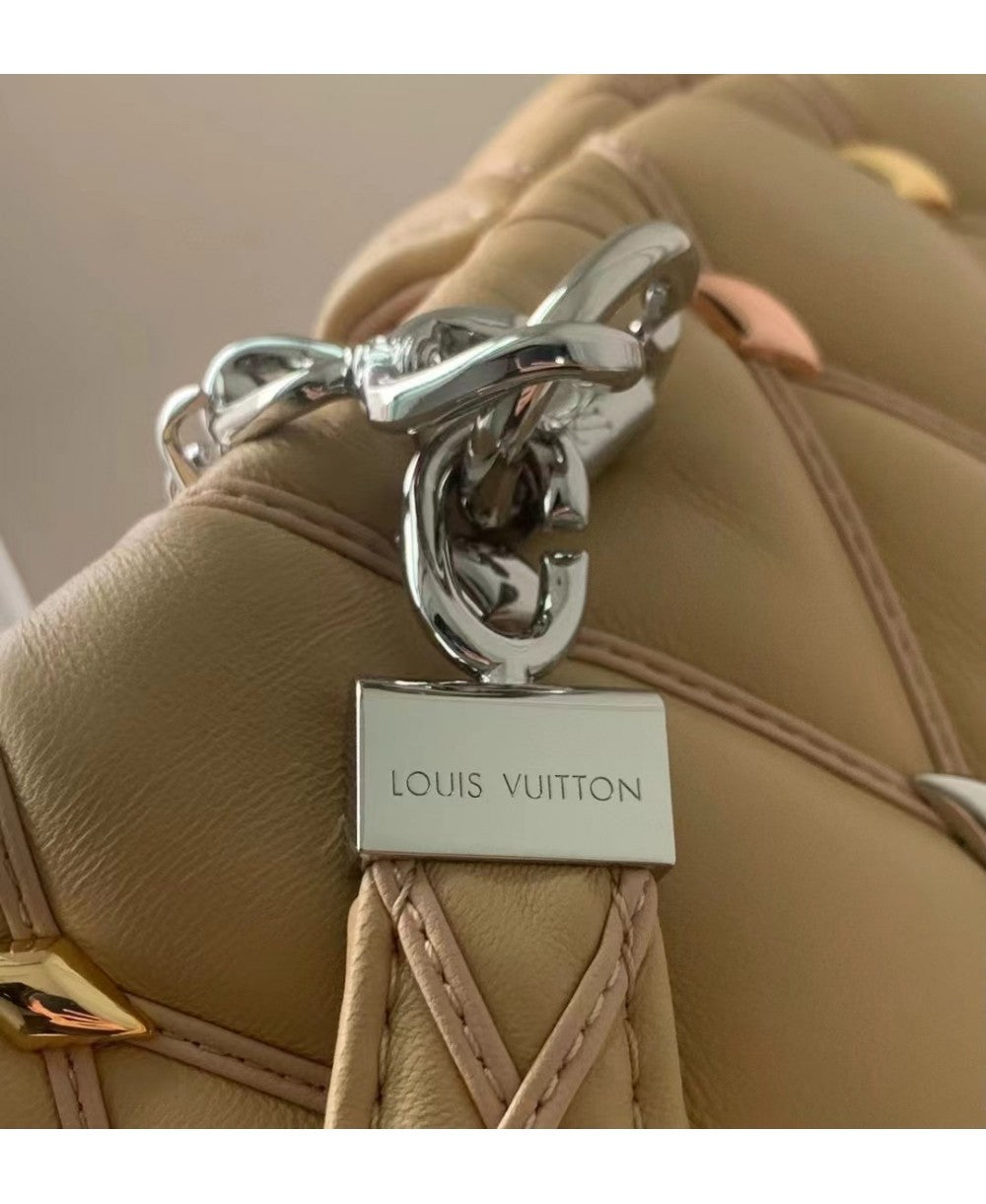 La GO-14 MM di Louis Vuitton è una borsa sofisticata che celebra la maestria artigianale della Maison. Realizzata in pelle di agnello dal raffinato colore beige, è impreziosita dall'iconico motivo Malletage trapuntato, simbolo di eleganza e tradizione. Decorata con borchie in metallo e completata dalla chiusura LV twist-lock, questa borsa è un accessorio di lusso pensato per chi ama lo stile senza tempo.